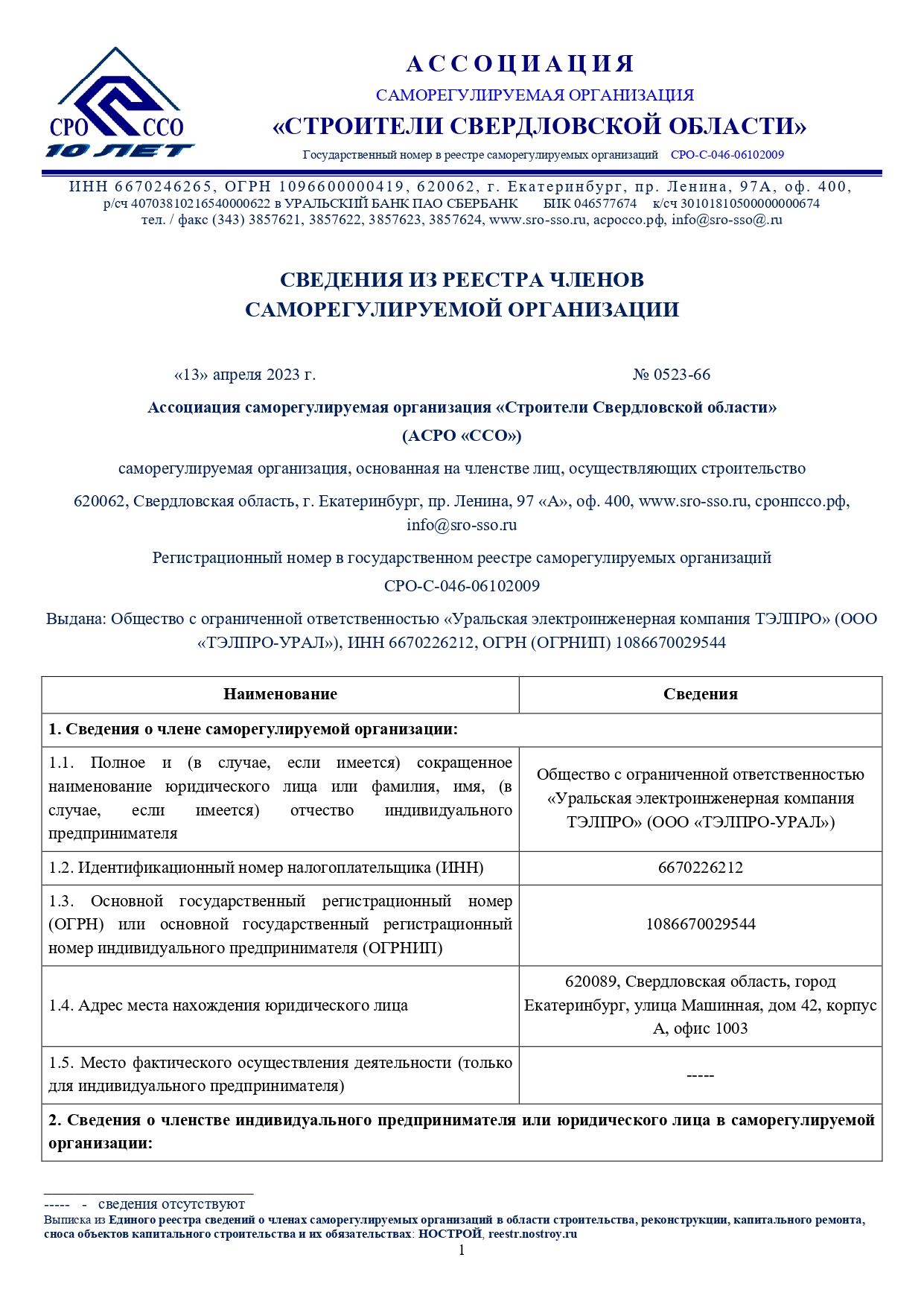 13 апреля компания ООО «ТЭЛПРО-УРАЛ» вышла на новый уровень ответственности по строительству, реконструкции и капитальному ремонту объектов электросетевого хозяйства.Теперь стоимость по договору с ООО "ТЕЛПРО -УРАЛ" может быть до 500 млн. р., новый статус и второй уровень финансовой ответственности подтверждается выпиской из реестра членов СРО "Строители Свердловской области".